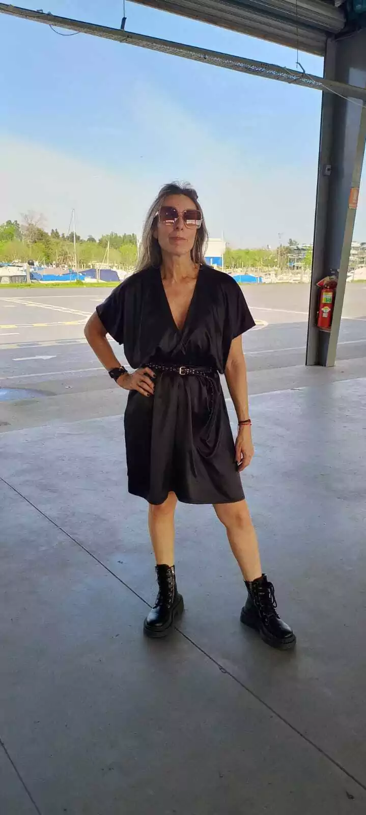 Vestido corto , con cuello cruzado abierto en la parte del escote/busto. Se lo acomodan ustedes más abierto o cerrado.